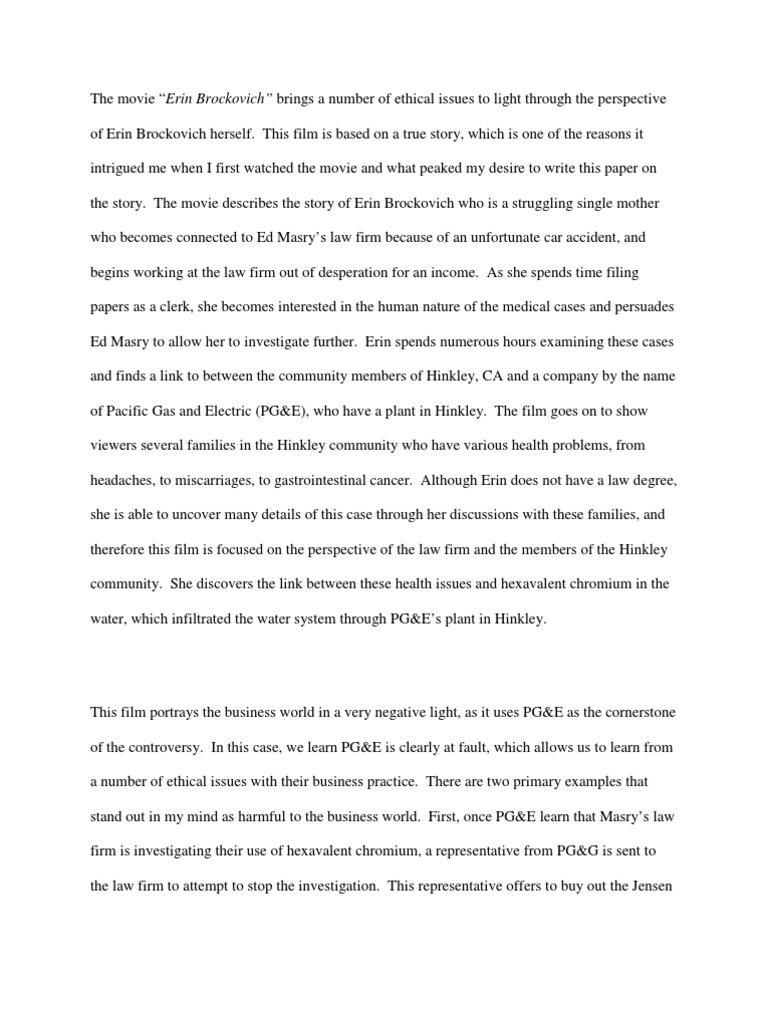 Erin stumbles upon some medical records placed in real estate files. Erin brockovichs real life was put into film in order to set as a good example for people specifically the leaders to practice ethical leadership and conviction when one knows that what one is fighting for is for a selfless good cause or for the benefit of common good. The movie describes the story of erin brockovich who is a struggling single mother who becomes connected to ed masrys law firm because of an unfortunate car accident and begins working at the law firm out of desperation for an income.