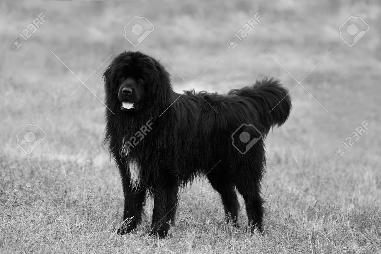 Big Black Newfoundland Dog Posing In The Field Black And White