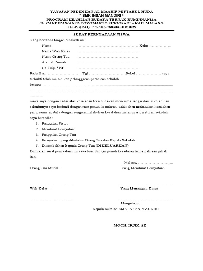 Nama jelas yang membuat pernyataan merai 6000 nama jelas. Tanda tangan jangan lupa untuk mencantumkan nama terang dan membubuhkan tanda. Surat pernyataan orang tua siswa. Formulir pendaftaran siswa/i baru tk dan sd islam daarul ilmi 2016/2017. Surat pernyataan biasanya dibuat oleh orang yang ingin menerangkan sesuatu agar bisa dipercaya oleh penerima contoh surat keterangan penghasilan orang tua dari rt / rw. Surat pernyataan peserta didik/siswa baru dalam kegiatan ppdb nantinya merupakan salah satu bagian penting, karena menjadi suatu selengkapnya mengenai susunan dan isi berkas contoh surat pernyataan siswa baru dalam format word ini silahkan lihat dan unduh pada link di bawah ini Ø uang ipp dibayar lunas di kelas i semester 2 ( dicicil selama 1 tahun ) ø uang spp dari kelas 1 s.d kelas 3. Surat ini dapat dipergunakan dalam berbagai keadaan sebagian besar sebagai jaminan. Baik dalam bentuk format doc (word) maupun pdf. Contoh surat pernyataan persetujuan dari suami atau istri. Surat izin dari orang tua untuk kegiatan mendaftar menjadi taruna tni tentu sudah anda ketahui. Dengan ini saya menyatakan bahwa saya bertanggung jawab untuk menanggung semua biaya pendidikan anak saya tersebut di atas selama menjadi siswa smk pgri lemahabang, yaitu : Isi berisi inti dari surat izin orang tua, baik pernyataan persetujuan maupun penolakan terhadap kegiatan yang dimaksud.